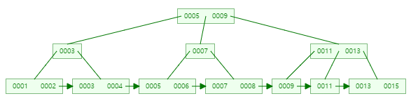 B+Tree는 B-Tree의 몇가지 문제점을 보완한 트리로, 가장 큰 차이점은 B+ Tree에서는 데이터를 저장하는 leaf노드만이 실제로 데이터를 갖고있고, 내부 노드들은 단순히 키값만을 갖고 있게 됩니다. 반면 B-Tree는 내부 노드와 leaf노드 모두 데이터를 가질 수 있습니다. 아래 그림을 보면 모든 leaf node들은 연결리스트로 연결되어 있습니다.